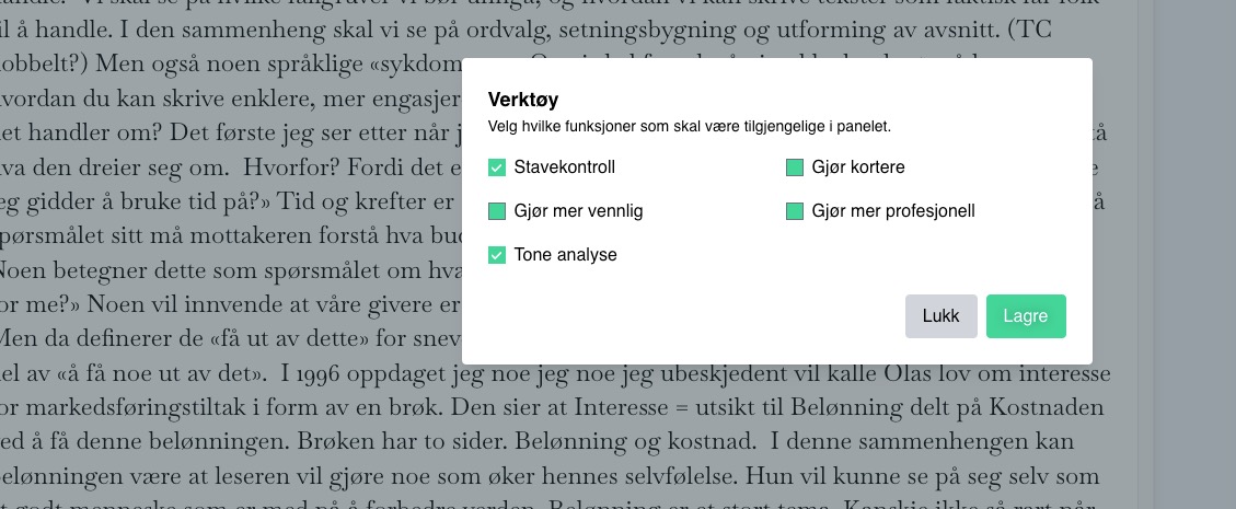 I tillegg har jeg koblet på noen funksjoner drevet av AI, for å hjelpe deg å forbedre teksten du har skrevet. Disse funksjonene koster mer å drive, og dermed koster de også litt å bruke, men som nyregistert bruker starter du med noen gratis "grann" på konto, slik at du kan prøve dem uten at de koster noe.